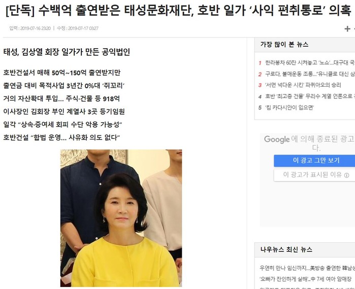 보도에 따르면 호반건설그룹 계열사들은 이 태성문화재단에 지난해까지 4년간 총 400억원을 기부출연했는데 정작 태성문화재단은 창립 9년만인 2013년 ‘남도작가 12인 특별전’을 열기까지 별도의 전시회 등을 열지 않았던 것으로 나타났다.