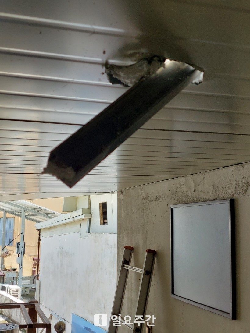 ▲부산 해운대구 우동 모텔 해체공사 현장에서 떨어진 쇠기둥이 민가 지붕을 뚫는 사고가 발생했다.(사진=제보자 제공)