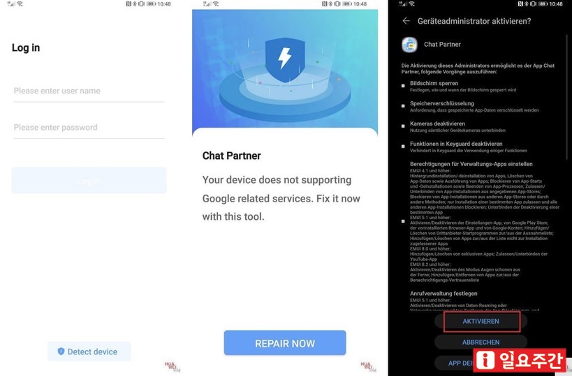 챗 파트너(Chat partner)라는 앱을 설치하고 화면을 따라 실행하면 바로 구글 서비스를 실행할 수 있다는 내용으로 앱 설치후 장치를 감지하고 복구 명령을 실행하면 바로 구글 활성화가 진행된다고 밝히고 있다.