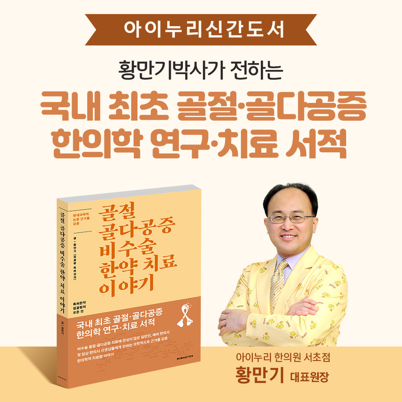 이러한 환경에서 이 책 “골절 골다공증 비수술 한약치료 이야기”(서초 아이누리 한의원 대표원장 황만기박사)는 골절 및 골다공증 등 근골격계 질환을 앓고 있는 환자분들과 가족, 또한 이를 치료하는 예비 한의사와 임상 한의사 선생님들에게 국내외 최신 한의학적 연구 방향과 결과에 대해 정확하게 정리된 정보를 알기 쉽게 전달하는 내용을 담고 있습니다.
