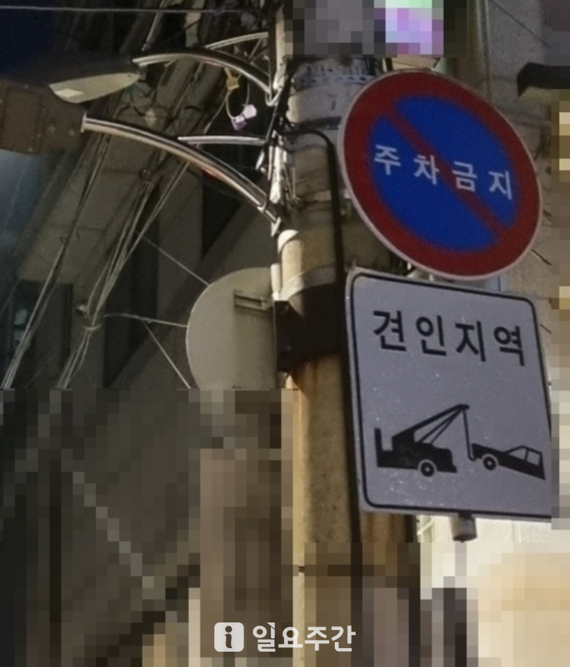 | ▲이면도로를 사이에 놓고 제보자와 맞은편 식당주인 간 주차 갈등이 빚어지고 있는 골목 전봇대에 걸려있는 주차금지 알림판.(사진=제보자 제공) |