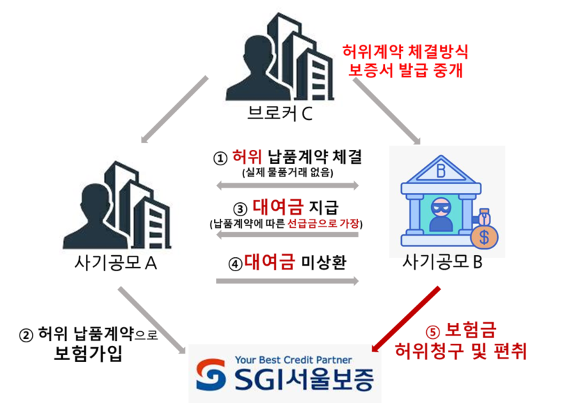 이번 적발사례는 제도권 자금 조달이 어려워진 업체 A사와 대여금을 통한 수익 취득 목적의 업체 B사가 공모해 허위의 물품공급계약을 체결한 뒤 진성계약인 것처럼 가장하여 보증서를 발급받고 B사는 보증서를 담보로 선금 명목의 대여금을 A사에게 지급 후 약정한 상환 기일에 대여금을 상환하지 못할 경우 SGI서울보증에 보험금을 청구해 손실을 보전하는 형태이다.