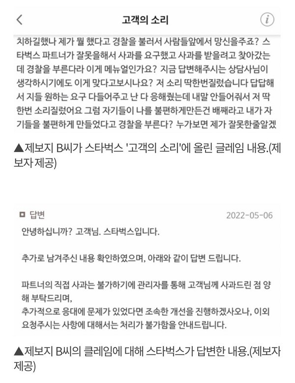 ▲ 지난 5월 6일자 본지 보도(온라인 기사 제목 : 스타벅스에 클레임 걸면 경찰 신고가 메뉴얼?…고객 “수모 겪고 정신과 치료”) 관련 스타벅스 고객 A 씨 제보 내용 갈무리.