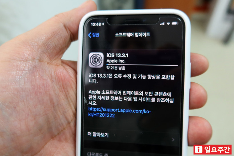 | ▲ OS 업데이트가 진행중인 아이폰 (사진=이수근 기자) |