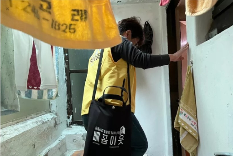 ▲ 사회적 고립가구 지원사업 잇다+ 협력기관 사업_ 서울 송파구 마천동 다세대 주택 밀집지역을 찾아 고립위험이 높은 고립가구 발굴을 위해 가정방문을 하고 있다.(마천종합사회복지관) (사진=서울시) |