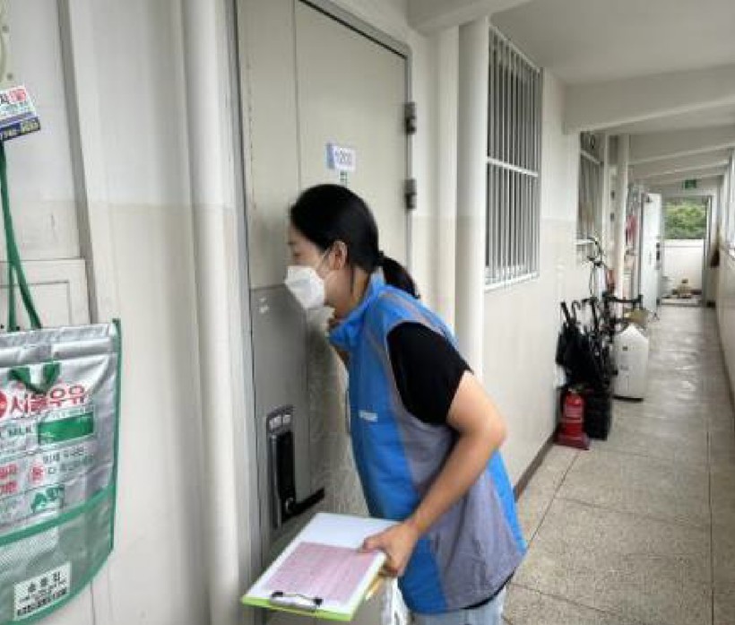 ▲ 사회적 고립가구 지원사업 잇다+ 협력기관 사업_서울 중랑구 신내동에서 임대아파트단지 내 1인 고립가구 안부확인을 하고 있다.(시립대종합사회복지관) (사진=서울시) |