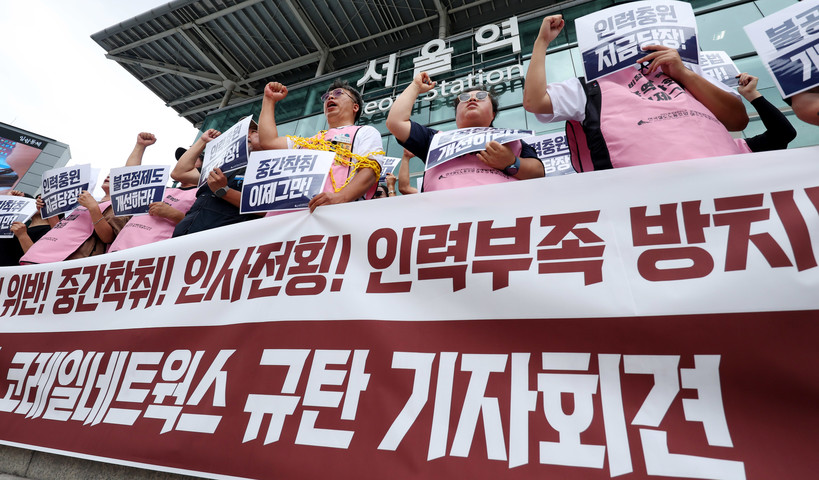 | ▲ 공공운수노조 전국철도노조 코레일네트웍스지부와 철도고객센터지부 등이 지난해 7월 16일 오전 서울 용산구 서울역 앞에서 코레일네트웍스의 근로기준법 준수 등을 촉구하는 기자회견을 하고 있다. (사진=newsis) |
