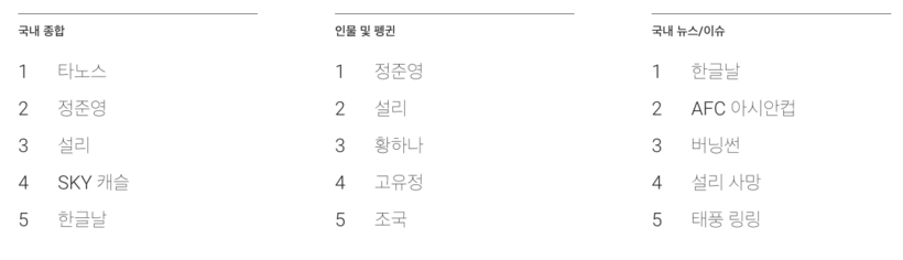 그렇다면 한국은 어떤 검색어를 가장 많이 찾았을까? 구글이 검색순위 상위로 제시한 국내 종합 1위는 타노스였고 정준영과 설리, SKY캐슬과 한글날이 차지했다. 특이한 것은 인물 순위에 평귄까지 적혀 있는데 이는 최근 주목받는 EBS의 캐릭터 '펭수'의 영향인 것으로 보인다.