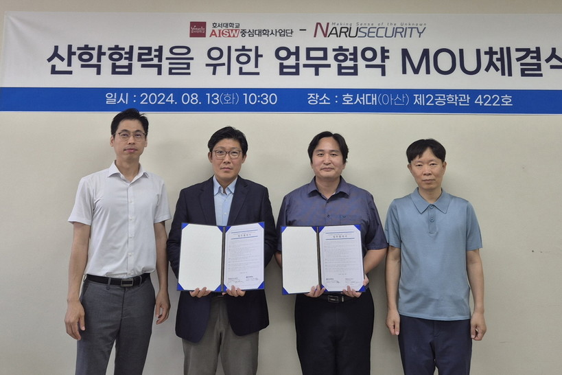 ▲ 호서대학교 AI·SW중심대학사업단과 ㈜나루시큐리티가 13일 산학협력을 위한 업무협약을 체결했다. (사진=호서대 제공) |