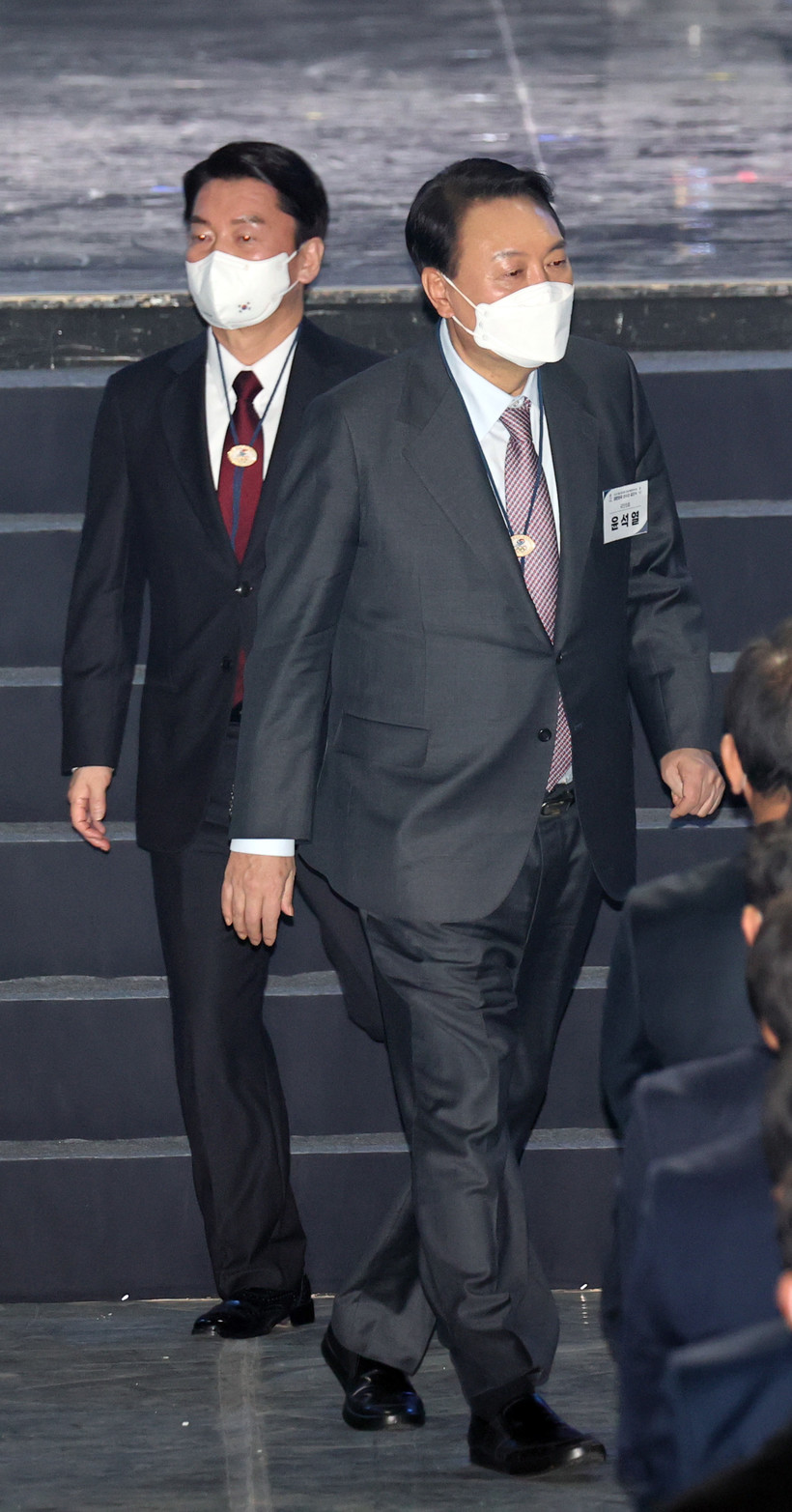 ▲ 윤석열 국민의힘 대선 후보와 안철수 국민의당 대선 후보가 25일 서울 송파구 올릭픽공원 올림픽홀에서 열린 2022 제24회 베이징동계올림픽대회 대한민국 선수단 결단식에서 기념촬영을 마친 후 자리로 돌아가고 있다. (사진=뉴시스/국회사진기자단)