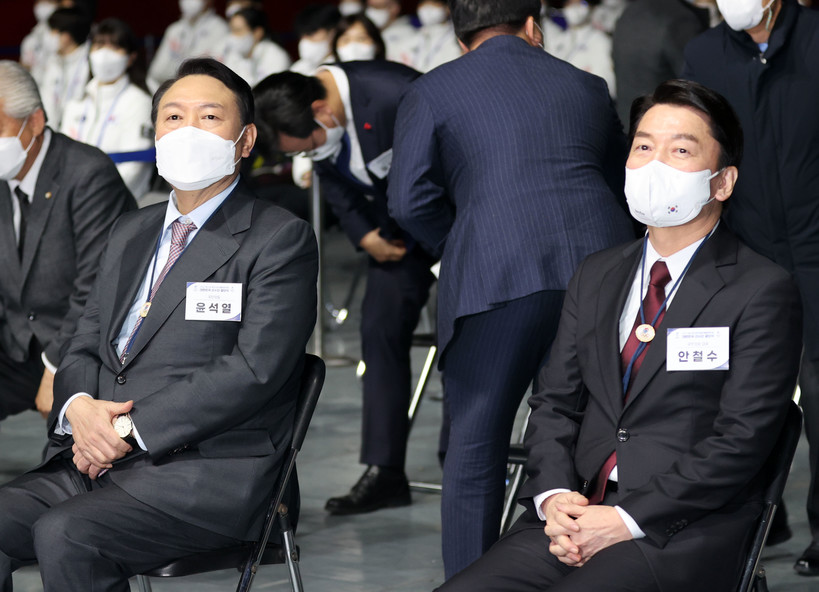▲ 윤석열 국민의힘 대선 후보와 안철수 국민의당 대선 후보가 25일 오후 서울 송파구 올림픽공원 올림픽홀에서 열린 2022 제24회 베이징동계올림픽대회 대한민국 선수단 결단식에 참석해 화면을 바라보고 있다. (사진=뉴시스/국회사진기자단)