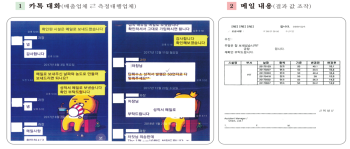 또한 측정을 의뢰한 대기업 담당자로부터 오염도 측정값을 조작해 달라는 내용의 SNS 문자를 파악해 측정 조작의 공모 관계를 확인하는 등 4253건에 대해서는 실제 측정값을 축소한 것을 적발했다. 측정값을 축소해 조작한 4253건에 대해 먼지, 황산화물, 질소산화물 등 대기오염물질 주요 항목별로 분석한 결과 측정값은 실제 대기오염물질 배출농도의 33.6% 수준으로 낮게 조작됐다.