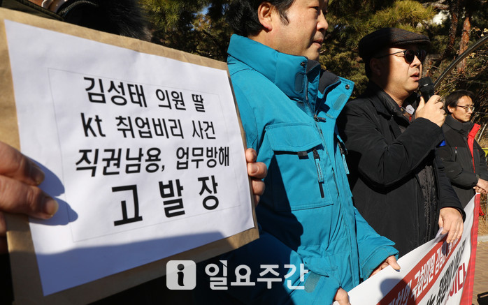 [일요주간=박민희 기자] 김성태 자유한국당 의원 딸의 KT 특혜채용 의혹과 관련해 KT새노조가 황교안 자유한국당 대표의 아들을 비롯해 유력 정치인 자녀들도 KT에 근무한 사실을 폭로하며, 채용비리 수사를 경영 전반에 대한 수사로 확대해야 한다고 촉구했다.