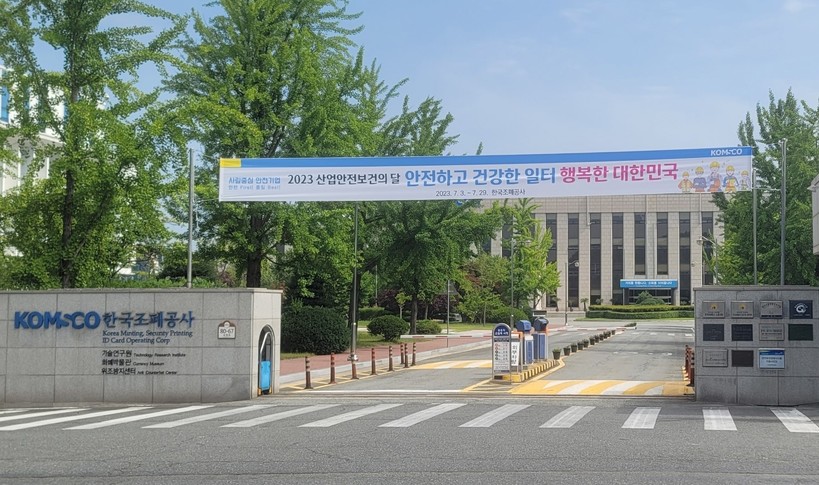 ▲ ‘2023산업안전보건의 달’을 맞이하여 한국조폐공사 본사(대전시 유성구 소재) 입구에 현수막이 걸려있다.(사진=조폐공사) |