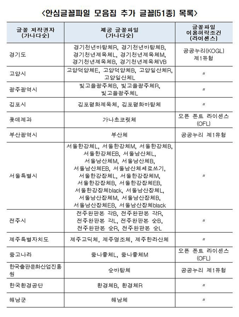 지난 3월 배포된 글꼴파일 71종에 새로 추가된 51종은 제주고딕체·부산체·환경체 등 정부와 지방자치단체, 공공기관이 개발한 48종을 비롯하여 롯데제과의 가나초코릿체와 중고나라의 중나좋체L·중나좋체M 등 민간 기업이 개발한 3종이다. 해당 글꼴은 모두 누리집을 통해 제공된다.