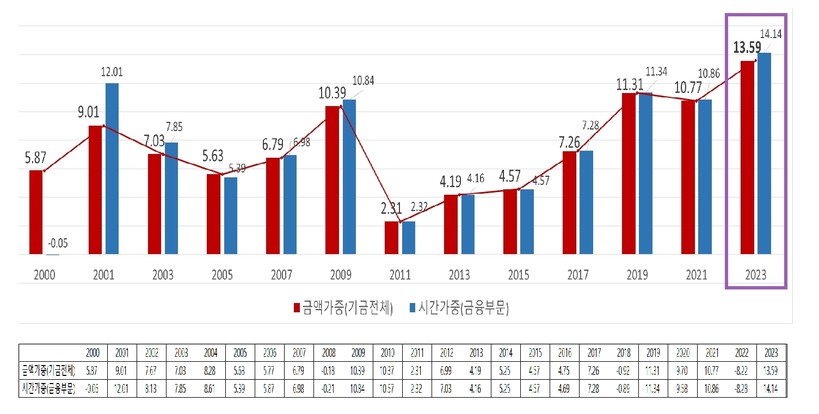 ▲ 연도별 기금수익률(금액가중/시간가중) 현황 (이미지=국민연금공단) |