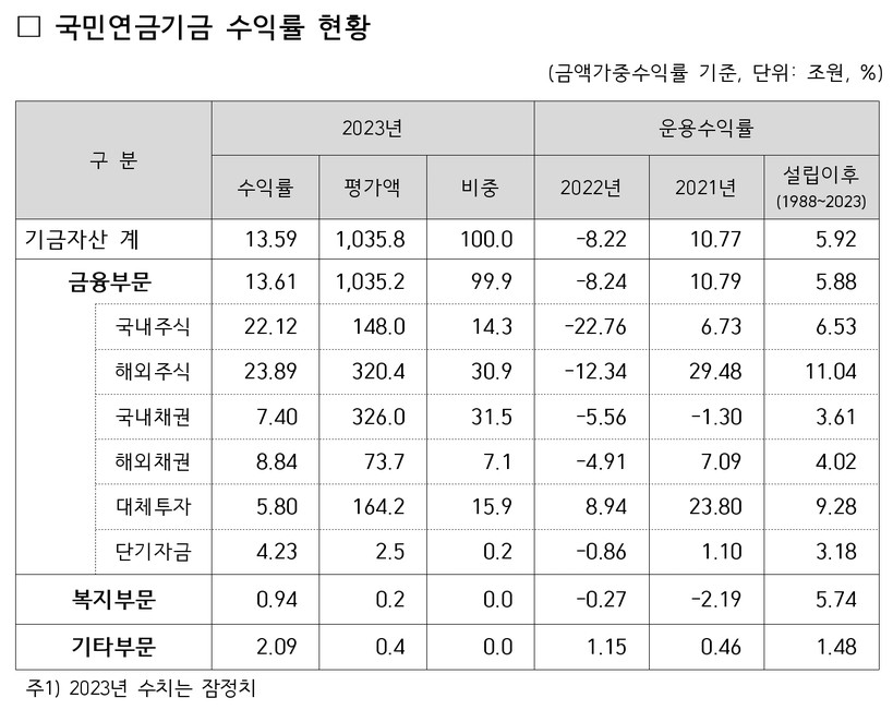 국민연금공단(이사장 김태현) 기금운용본부는 2023년 말 기준 국민연금기금 적립금 1,036조원, 수익금 127조원, 수익률 13.59%(잠정)를 기록했다고 28일 밝혔다.
