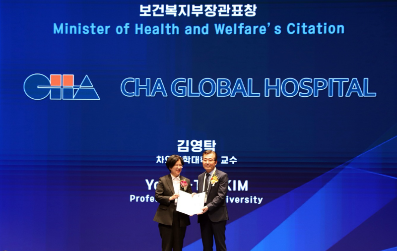 ▲ 차 국제병원 김영탁 원장(사진 오른쪽)이 보건복지부 장관 표창을 받고 기념사진을 촬영하고 있다.(사진=차병원그룹 제공) |