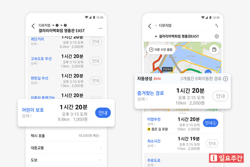 | ▲SK텔레콤 T맵 8.1 버전에 추가된 스쿨존 우회경로 안내 및 즐겨찾는 경로 추천 기능 (이미지 편집=일요주간) |
