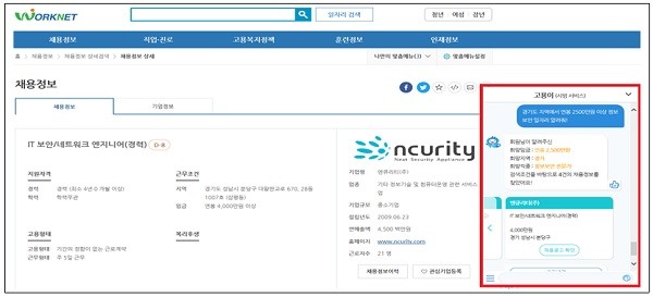 [일요주간 = 노현주 기자 기자] 고용노동부와 한국고용정보원은 국가일자리포털 워크넷에서 채용정보 자동 상담 챗봇 ‘고용이’ 시범 서비스를 시작한다고 4일 밝혔다.