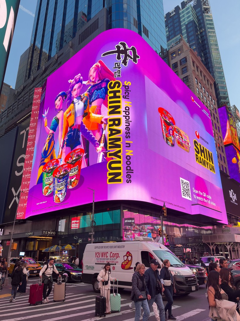 | ▲ 농심은 지난 18일 미국 뉴욕 타임스퀘어에서 영화 <‘케이팝 데몬 헌터스’>와 협업한 신라면 출시를 기념해 글로벌 캠페인을 진행했다. (사진=농심 제공) |