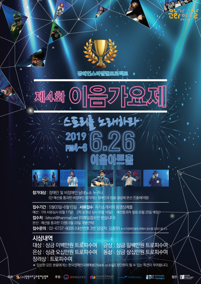 [일요주간=김쌍주 대기자] 문화체육관광부(장관 박양우), 한국장애인문화예술원( 이사장 안중원), 국민체육진흥공단(이사장 조재기)이 후원하고, (사)빛된소리글로벌예술협회(이사장 배은주)가 주최하는 제4회 이음가요제가 오는 26일 오후 4시부터 대학로 이음아트 홀에서 개최된다.
