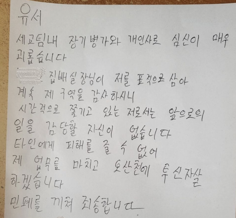 ▲ 피해자 A 씨가 작성한 유서. (사진=전국민주우체국본부 제공) |