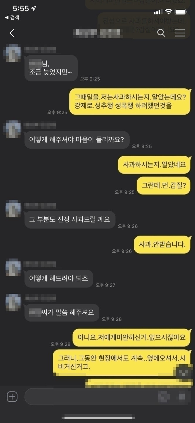 ▲포스코 광양제철소 소속 간부 A 씨가 협력업체 여직원 B 씨에게 성폭행과 관련해 합의를 종용하는 카톡 메시지 내용.(제보자 제공) |