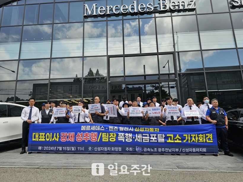지난 15일 전국금속노동조합 광주전남지부 신성자동차지회(지회장 김원우, 이하 금속노조)는 광주 서구 신성자동차 본점 앞에서 기자회견을 열어 이 같은 사실을 폭로하며 신성자동차 대표이사 최모 씨를 강제 성추행, 팀장을 폭행과 종합소득세 포탈 혐의로 경찰과 국세청에 신고했다고 밝혔다.