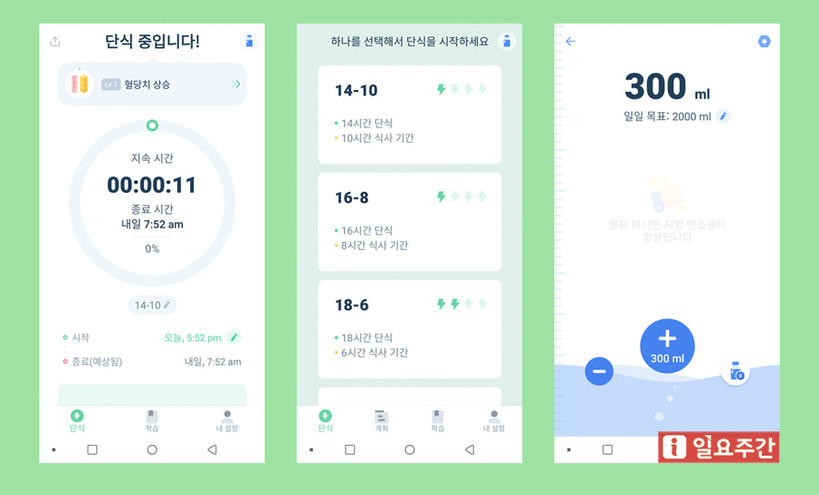 ▲간헐적 단식을 실행을 도와주는 앱, 단식어플 (이미지 편집=일요주간) |