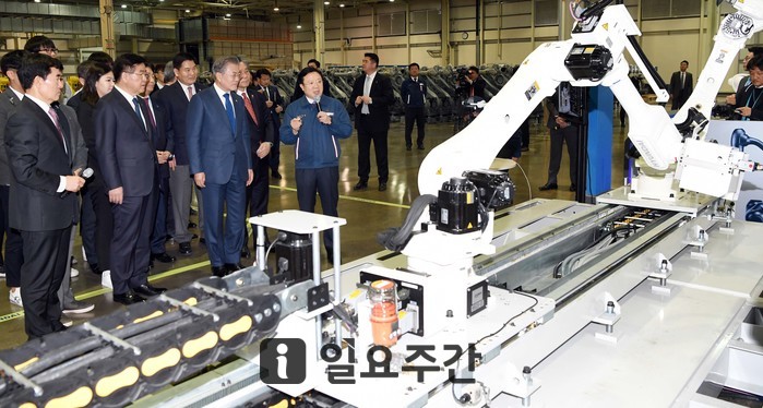 ▲문재인 대통령이 지난 22일 '로봇산업육성 전략보고회'가 열린 대구 달성군 현대로보틱스에서 로봇시연을 보고 있는 모습. |