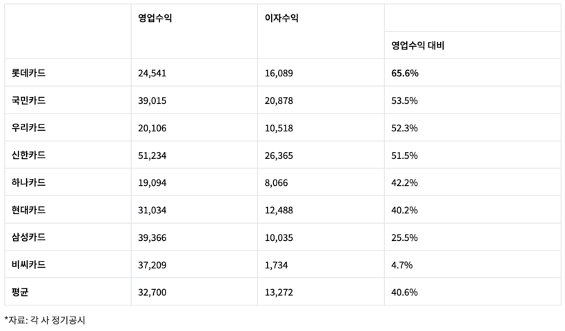 롯데카드의 이자수익 비중은 8개 카드사 중 가장 높았는데 신용카드사 평균은 40.6%에 불과했다.