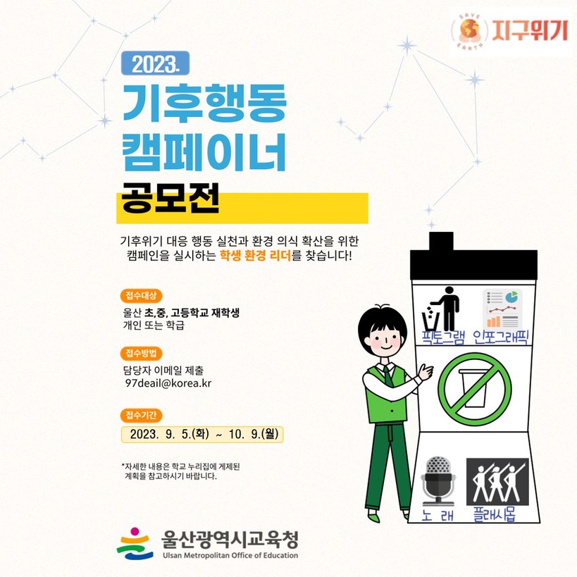 2023 기후행동 캠페이너 공모전은 지구 환경의 소중함을 깨닫고, 환경문제에 대한 공감대 형성을 위해 마련된 행사로 울산지역 초·중·고 재학생은 누구나 참여 가능하다.