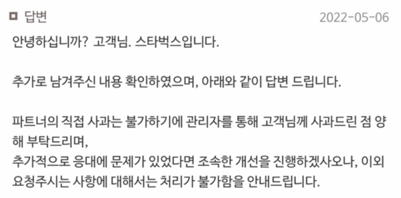 스타벅스 측은 B씨가 ‘고객의 소리’에 남긴 이 같은 클레임에 대해 “파트너의 직접 사과는 불가하기에 관리자를 통해 고객님에게 사과를 드린 점 양해 부탁드린다”며 “소통의 오류로 경찰 방문으로 고객님께 불편을 드렸던 것 같아 무거운 마음이다”고 밝혔다.
