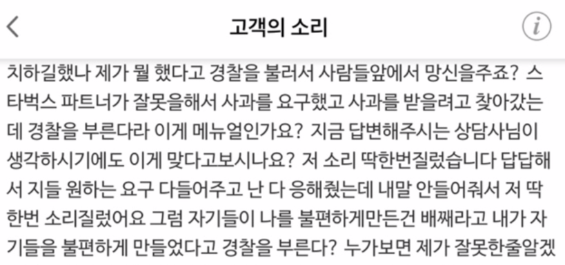 저도 지난 주 중구에 있는 매우 큰 대형 스타벅스 매장의 파트너라는분과 고객센터 직원으로부터 본 기사와 유사한 수모를 겪었습니다.