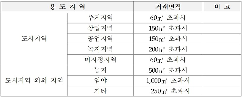 ▲ 토지거래계약시 허가를 받아야 하는 면적 (표=울산시) |