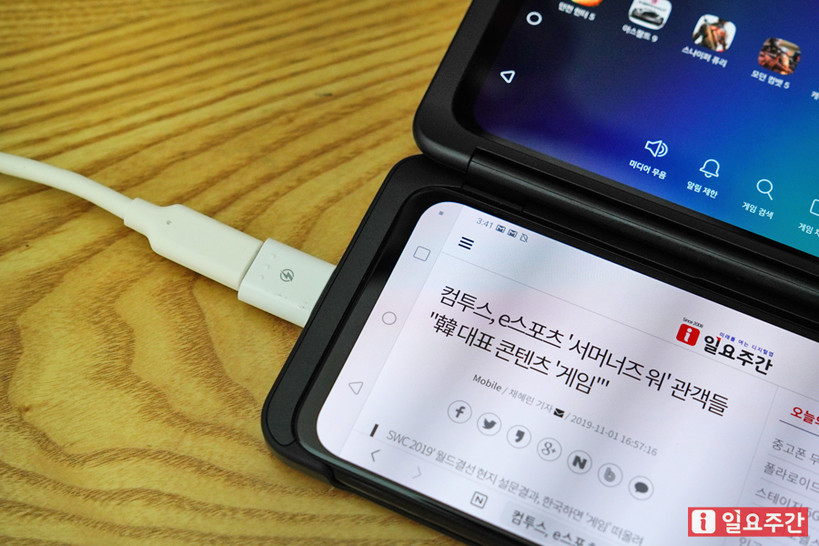 | ▲ 듀얼스크린을 끼운 후 충전하려면 어댑터가 필요하다 (사진=지혜수 기자) |