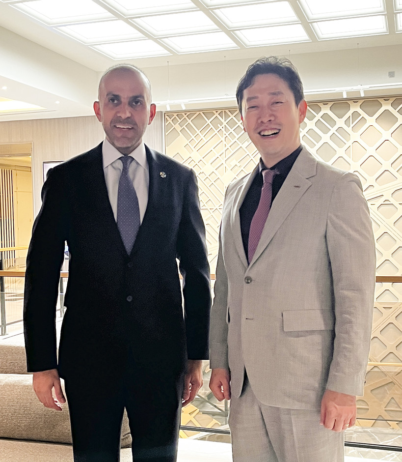 ▲ 윤형중 한국공항공사 사장(오른쪽)이 아이만 알 호스니 오만공항 CEO(왼쪽)와 Airports Innovate 협력방안을 논의하고 기념촬영을 하고 있다.(사진=한국공항공사) |