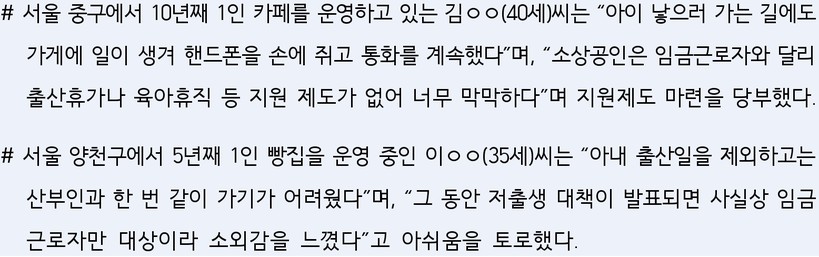 1인 자영업자와 프리랜서는 본인 또는 배우자 출산시 짧게는 수일에서 길게는 수개월까지 가게 문을 닫아야 하기 때문에 당장 생계활동에 차질이 생긴다. 대체인력 구하기도 쉽지 않은데다 채용을 하더라도 인건비 추가 지출이나 기존 수입감소가 불가피하지만, 현행 임신‧출산 지원제도는 임금근로자를 중심으로 설계돼있어 이들에 대한 제도적 지원은 사실상 전무한 실정이다. “출산 전날까지도 배달했다”는 한 자영업자의 말이 이런 현실을 대변한다.