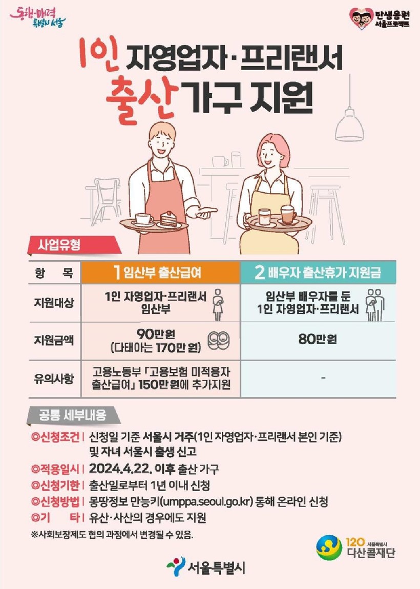 출산한 여성 자영업자와 프리랜서는 기존 고용보험 지원(150만 원)에 서울시가 추가로 90만 원을 지원해 총 240만 원(90일)을 보장받는다. 또한, 그동안 지원이 전무했던 출산 배우자를 둔 남성 1인 자영업자와 프리랜서도 ‘배우자 출산휴가 지원금’ 80만 원을 받게 된다.