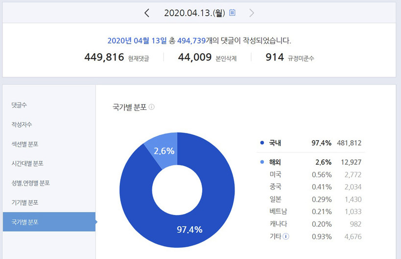 실제 네이버가 온라인에 하루 단위로 공개하는 뉴스 댓글 통계에 따르면 지난 13일 작성된 49만4739개 댓글 가운데 국내 비중이 97.4%이며 해외 비중은 2.6%로 미미하다. 또한 이 가운데 중국에서 작성된 댓글의 비중은 0.41%에 그쳤다.