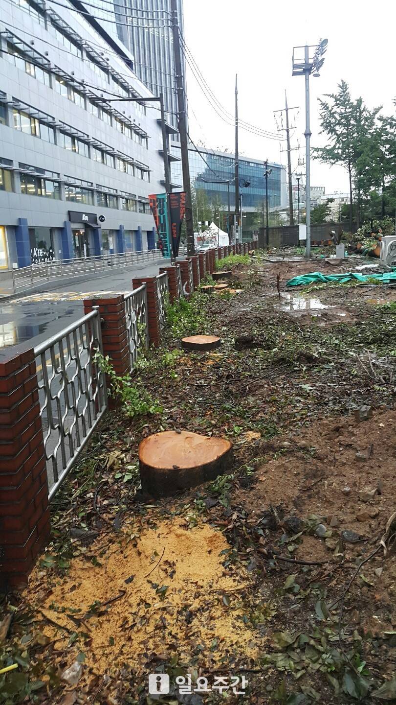 ▲넷마블이 기부채납한 부지에 있던 수십그루의 나무들이 구로구청의 도로확장 공사 과정에서 베어져 일부 주민들이 강력반발하고 있다.(사진=제보자 제공)