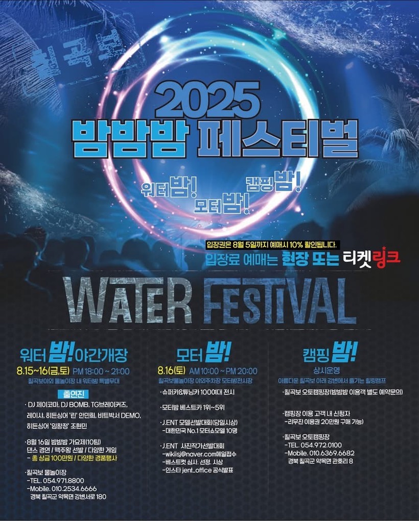 8월 15일부터 16일까지, 칠곡보 야외 물놀이장과 주차장, 오토캠핑장을 무대로 ‘워터밤’, ‘모터밤’, ‘캠핑밤’이 차례로 펼쳐진다. 시원한 물줄기와 음악, 화려한 슈퍼카, 반짝이는 별빛까지… 여름밤의 낭만과 짜릿함이 한자리에 모인다.