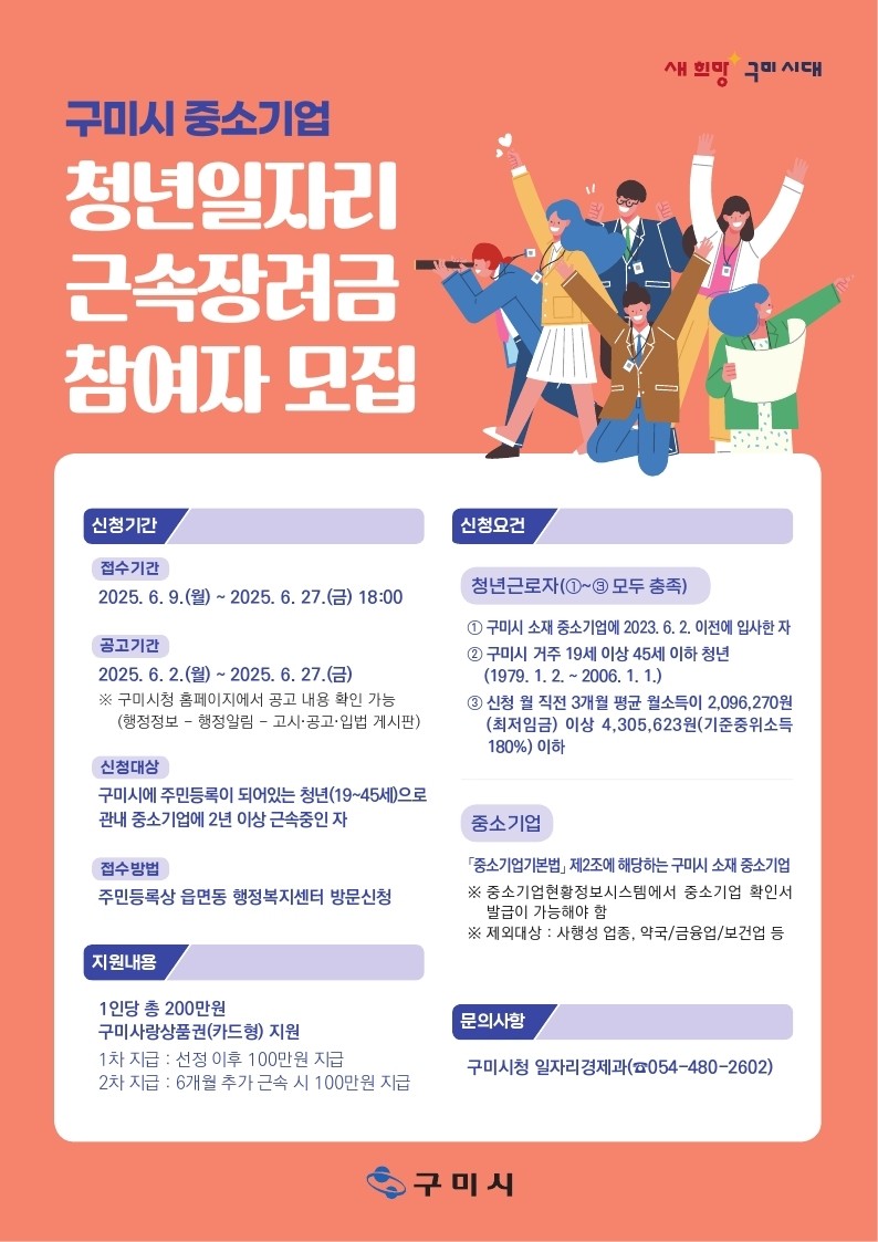 이번 사업은 급증하는 청년 유출 문제 해결과 지역 중소기업 청년 일자리 안정 확보를 위해 추진하며, 구미시 소재 중소기업에 2년 이상 근속한 청년 근로자를 대상으로 200만원의 근속장려금을 지급한다.