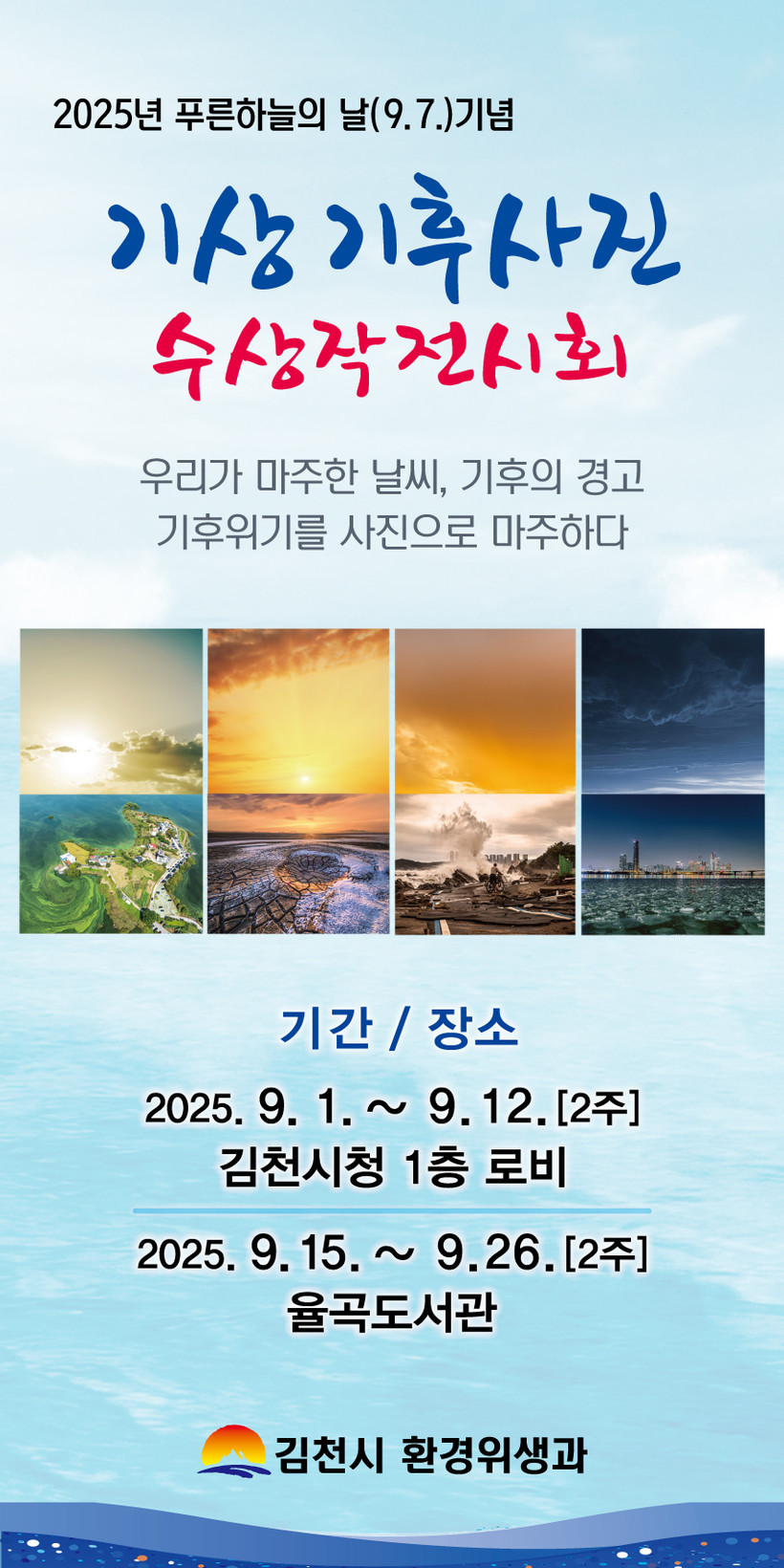 이번 전시회는 김천시청에서 9월 1일부터 9월 12일까지, 율곡도서관에서 9월 15일부터 9월 26일까지 총 한 달간 열릴 예정이며, ‘갈라진 땅’, ‘녹조의 습격’, ‘숨 막히는 공간들’ 등 기상과 기후를 주제로 전문가와 시민들의 사진 작품 17점을 전시한다.