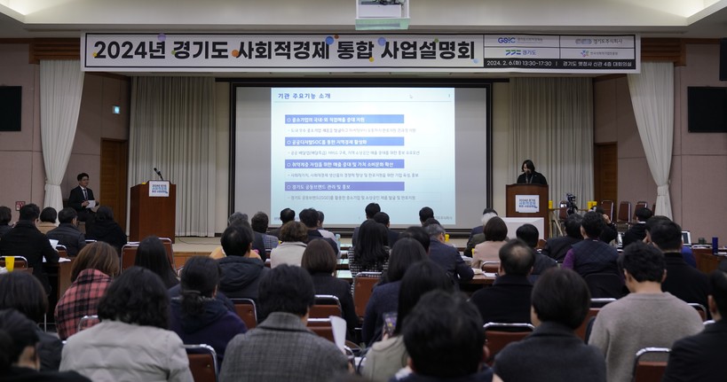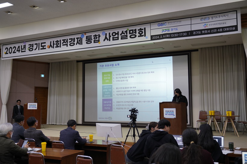 경기도주식회사는 6일 수원시 경기도청 옛 청사에서 열린 ‘2024 경기도 사회적경제 통합 사업설명회’에서 올해 사회적경제 생태계 확장을 위한 활성화 사업의 방향과 계획을 설명했다. 이날 설명회에는 경기도 사회적경제기업과 지원 조직, 도민 등 150여 명이 참석했다.