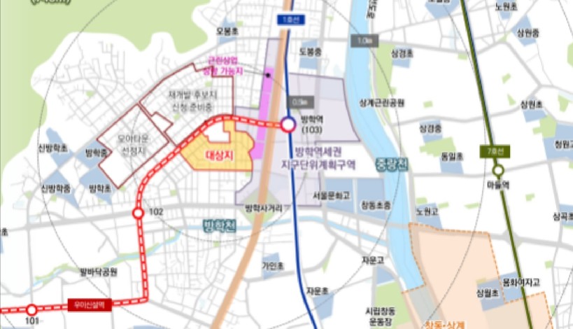 우이신설선 연장으로 방학역이 우이신설선과 1호선이 만나는 더블 역세권으로 위상변화가 기대되며, 방학역세권 지구단위계획 재정비로 대상지와 맞닿은 지역이 근린상업지역 상향 가능지로 도시변화가 예상되는 지역이다.