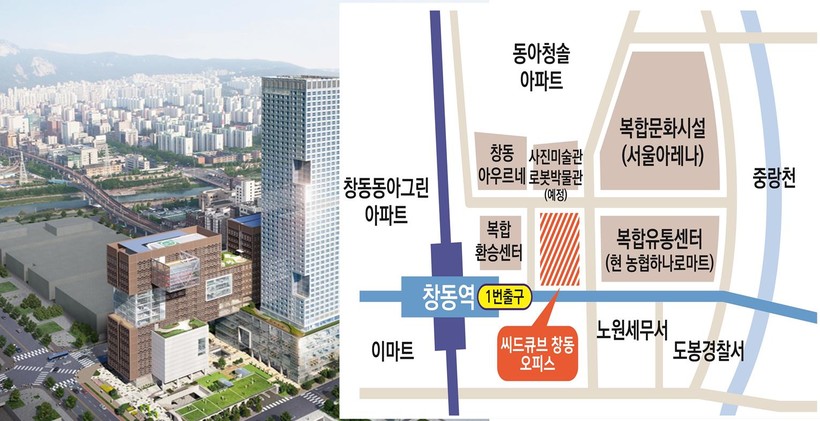 ▲ 창동 창업 및 문화산업단지 '씨드큐브 창동' 프리미엄 임대 오피스 조감도 및 위치도. (이미지=SH공사) |