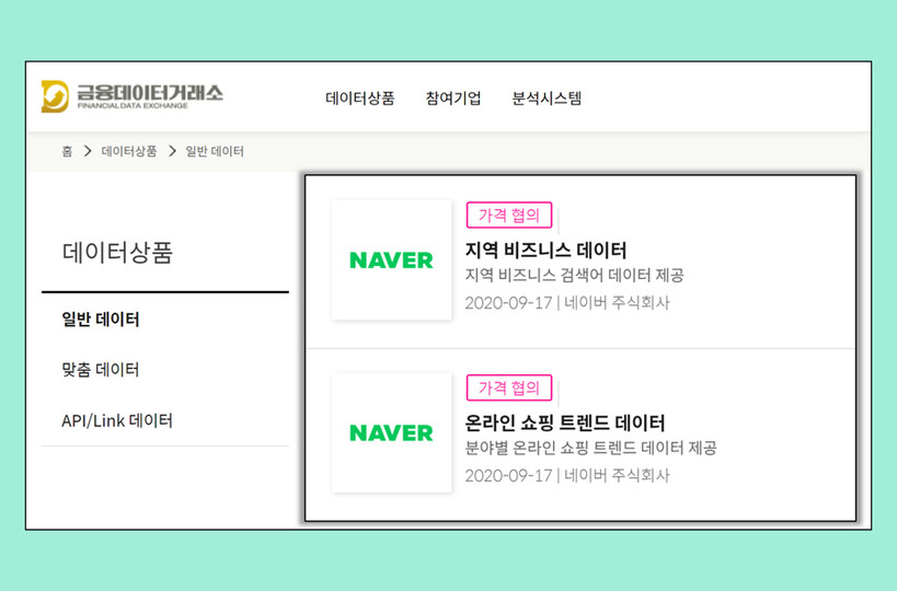 ▲네이버가 금융데이터거래소에 등록한 데이터 (이미지=네이버) |