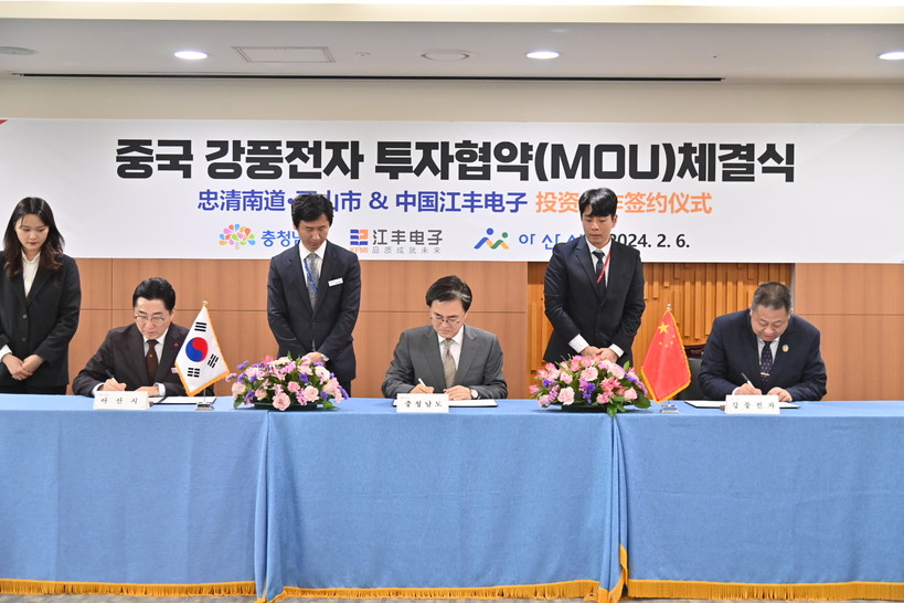 김태흠 지사는 6일 도청 접견실에서 왕쉐쩌 중국 강풍전자 총경리, 박경귀 아산시장과 투자협약(MOU)을 체결했다.